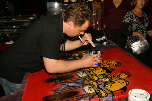 The materials he uses are spray-gun and paints with brushes and stencils, with which he expresses his emotions directly in his art work. He paints lively, colorful works and chooses for marked characters, with pronounced slogans. The majority of his paintings show what drives him: Music, reality, relationships, relaxations and love!
